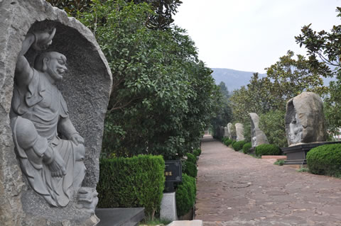 栩栩如生的十八羅漢,沿著步道整齊排列,每尊羅漢高度近2米,全部采用福建青草石整體雕刻而成,石材的造型不同,羅漢的形態(tài)各異,形成了一個頗具看點(diǎn)的景觀。