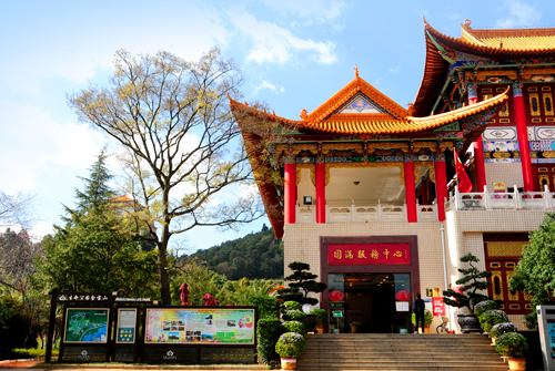 文化廣場(chǎng)以迎賓路為軸線展開(kāi),花壇排列,綠草如茵,鮮花四季盛開(kāi)。氣勢(shì)恢宏的門坊上,中國(guó)書(shū)法家協(xié)會(huì)會(huì)長(zhǎng)劉藝先生題寫(xiě)的“金寶山藝術(shù)園林”貼金大字熠熠生輝。以門坊為前導(dǎo),鮮花副食店、佛事用品店、素食軒、園滿中心等明清風(fēng)格建筑群錯(cuò)落有致,營(yíng)造出博大、典雅的氛圍。