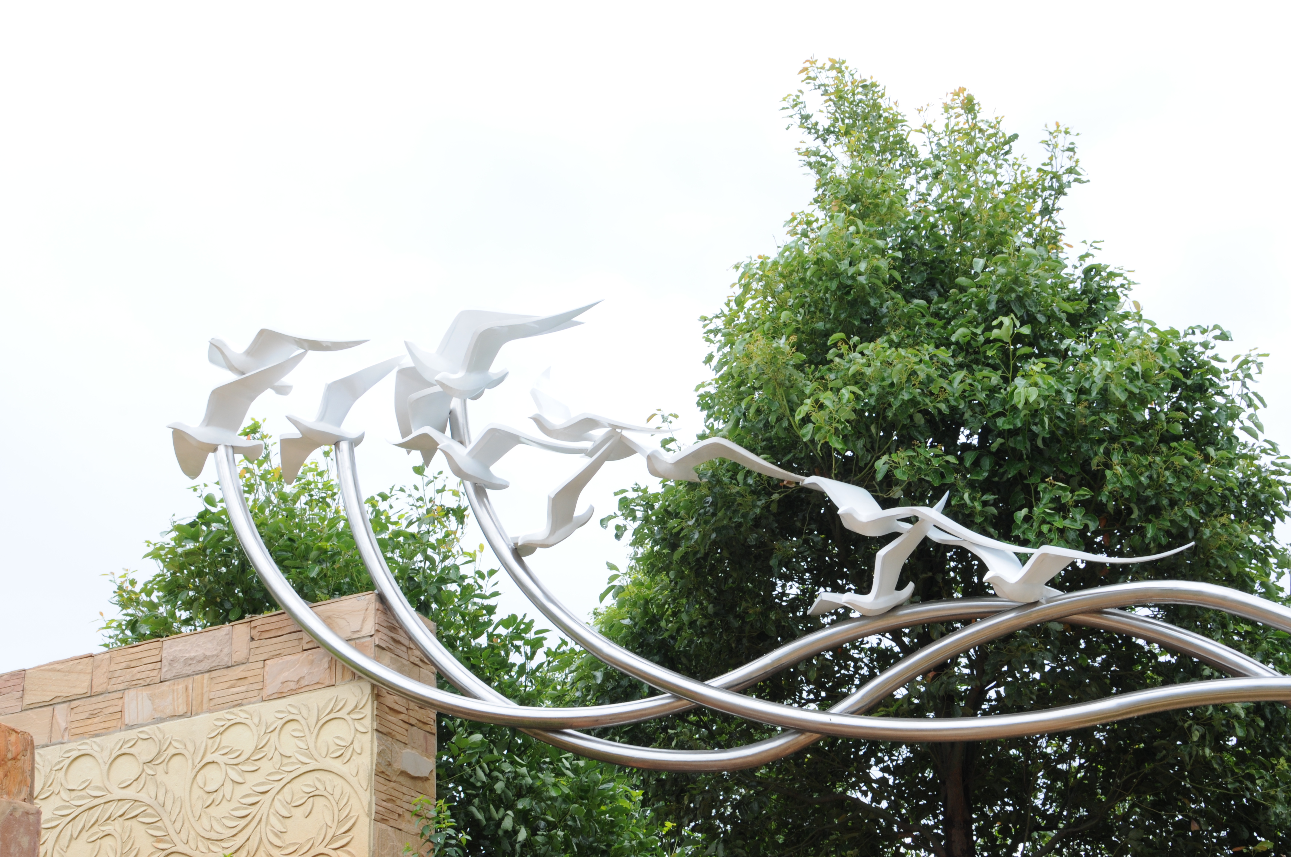 在兩面?zhèn)葔ι,鐫刻著八位醫(yī)學(xué)名人的名言摘錄或社會(huì)評(píng)價(jià),多視角地表現(xiàn)出對(duì)職業(yè)的理解和詮釋。側(cè)墻上用潔白的五瓣杏花造型裝飾,寓意著“譽(yù)滿杏林”,整個(gè)園區(qū)運(yùn)用了溫暖的色調(diào),寓意“杏林春暖”。在主景墻連接處,用不鋼的曲線雕塑巧妙連接,上面是姿態(tài)各異的海鷗飛翔,具有濃郁的春城色彩并寓意無限遠(yuǎn)景。在入口小廣場壁面上,鐫刻著“仁愛園記”,是金寶山建園思想的綜述性表達(dá)。