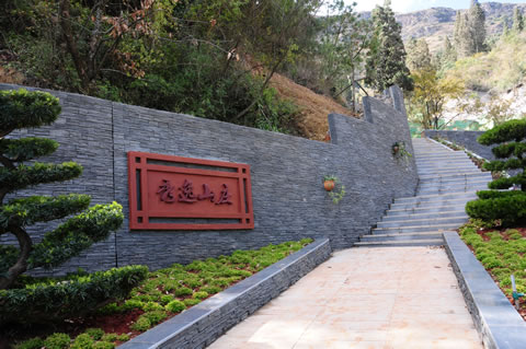 秀逸山莊是一處清靜、閑逸的所在。山莊入口是“三碗水”景觀,泉水依次從石上的三個水碗中流過,一幅“靜聽松風(fēng)”的古畫,已然勾起千古幽思。發(fā)源于碧雞山脈的一泓清泉——秀逸泉,通過澗槽沿壁而下,淙淙流淌的泉水給山莊帶來了別具情趣的靈動和生機。兩側(cè)山脈逶迤而下,原生態(tài)的林木茂盛而蒼勁,隨著季節(jié)變化,在一片蔥綠中,亦有璨黃繽紛和紅葉點染。