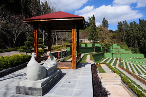 沿著石階緩步而上,我們能夠感受到這里有一種深居幽谷、門戶半開的意境,有幾分超脫紅塵的氛圍。在高低錯落的大小成臺前,橫向分布著一排排花池,用繽紛的花帶裝點出絢麗多彩。遠眺前方,山巒起伏,海闊天空,讓人心胸豁然開朗。