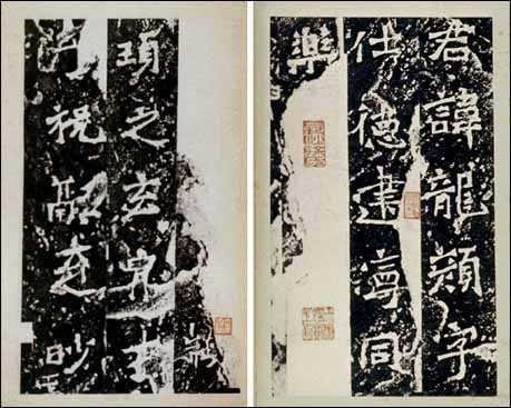 《爨龍顏碑》立于南朝宋大明二年(四五八),比《爨寶子碑》晚五十三年?梢哉f這兩塊碑是同時代的作品。它的結(jié)體以方整為主,但轉(zhuǎn)折處已使用圓轉(zhuǎn)筆法,而不像《爨寶子碑》那樣如矩形的折角,更具有楷書的特征。我們可以從《爨龍顏碑》筆畫的圓潤剛強(qiáng),窺見其運筆實源于篆法,起筆雖有方圓之分,但筆劃均極為厚重!鹅帻堫伇吩谑址ㄉ细┭鲆咀,疏密相間,在結(jié)構(gòu)上姿態(tài)奇逸,舒斂自如?涤袨樵u說:“下畫如昆刀刻玉,但見渾美;布勢如精工畫人,各有意度,當(dāng)為隸楷極則。”