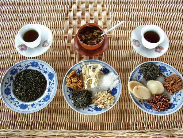 歲月蹉跎,滄海桑田,茶飲在大理逐步發(fā)展完善,并以一種嶄新的方式呈現(xiàn),“三道茶”這一獨特的茶道被賦予了更多的文化內(nèi)涵。“三道茶”第一道為“苦茶”,制作時,先將水燒開,由司茶者將一只小砂罐置于文火上烘烤。待罐烤熱后,即取適量茶葉放入罐內(nèi),并不停地轉(zhuǎn)動砂罐,使茶葉受熱均勻,待罐內(nèi)茶葉轉(zhuǎn)黃,茶香噴鼻,即注入已經(jīng)燒沸的開水。少頃,主人將沸騰的茶水傾入茶盅,再用雙手舉盅獻給客人。因此茶經(jīng)烘烤、煮沸而成,看上去色如琥珀,聞起來焦香撲鼻,喝下去滋味苦澀,通常只有半杯,一飲而盡。第二道茶,稱之為“甜茶”。當客人喝完第一道茶后,主人重新用小砂罐置茶、烤茶、煮茶,并在茶盅里放入少許紅糖、乳扇、桂皮等,這樣沏成的茶,香甜可口。第三道茶是“回味茶”,其煮茶方法相同,只是茶盅中放的原料已換成適量蜂蜜,少許炒米花,若干粒花椒,一撮核桃仁,茶容量通常為六七分滿。這杯茶,喝起來甜、酸、苦、辣,各味俱全,回味無窮。