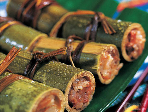 傣族喜歡飲用“竹筒茶”,傣族語“臘跺”,這是一種充滿詩情畫意的飲茶方式,先用曬干的春茶放入剛砍回的香竹筒內(nèi),放在火塘的三腳架上烘烤,6—7分鐘后,竹筒內(nèi)茶葉軟化,用木樟將竹筒內(nèi)茶葉舂壓后再裝進茶葉,這樣邊裝、邊烤、邊舂,直至竹筒內(nèi)茶葉填滿舂緊為止,待茶烤干后,削開竹筒取出圓柱型的茶葉,掰少許茶葉放人碗中,沖人沸水約五分鐘即可飲用。這種竹筒茶,既有竹子的青香,又有茶葉的芳香,非常可口。