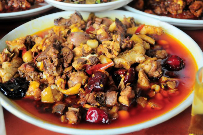 辣子雞的用料以剛打鳴的公雞為最好,一定要是短腳桿自然啄食的土雞,這邊顧客剛挑好雞,稱罷斤兩,那邊小工已三下五除二把雞拾掇干凈,斬民小塊。主廚的師傅對(duì)配方是保密的,只知要用上好的菜油、豬油、辣椒面和大蒜,并且辣椒的量頗為可觀。從落座到一盤紅中泛白、辣味十足的雞上桌,前后不過(guò)一二十分鐘,速度快得和辣味一樣驚人。這辣子雞的辣不似尋常辣味,是辣中有香,辣而不過(guò),讓人吃一口還想吃第二口,直到滿頭大汗,欲罷不能。如果顧客對(duì)“辣”實(shí)在敏感,不要緊,可以要求一半的雞做辣子雞,另一半拿來(lái)黃燜,一樣噴香撲鼻,卻溫和平淡了許多。光吃雞不行,配套的小菜也都是預(yù)備好的:炸洋芋條、炸臭豆腐、淡煮苦菜湯、豆花、小饅頭,一色清淡,正與火爆的辣子雞互補(bǔ),由不得食客不滿意。吃剩下的雞肉店家會(huì)囑咐你打包帶走,拿回家去下面條,足可余香三日。