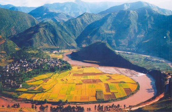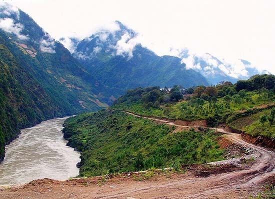 千里怒江從西藏境內(nèi)一路而下,流經(jīng)丙中洛鄉(xiāng)日丹村附近時(shí),由于絕壁阻隔,江流猛然向西突轉(zhuǎn),流出三百多米后,又被丹拉大山的陡坡?lián)踝,江流再次轉(zhuǎn)向南方。江水咆哮,氣勢磅礴。江流的大回環(huán),在峽谷里形成了一個(gè)很大的半圓形大灣。灣上的臺(tái)地高出江面約五百米,平坦開闊,三面環(huán)水,風(fēng)光綺麗。往北4公里,就是貢山最北端的丙中洛鄉(xiāng)。出境就是西藏自治區(qū)的察隅地區(qū)。怒江、瀾滄江、金沙江咆哮而下,貢山是“三江并流”的最狹窄點(diǎn)。自西向東二江(獨(dú)龍江、怒江)三山(擔(dān)當(dāng)力卡山、高黎貢山、碧羅雪山)縱貫全境。