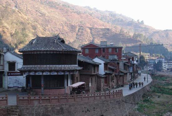 利之所在,趨之若鶩,F(xiàn)在的娜姑鎮(zhèn)是配合以禮河電站新建的,真正的古鎮(zhèn)在偏僻的白霧村。當(dāng)年的娜姑是熱鬧非凡,客棧、酒樓、妓院、賭館,文官武將、富商大賈、販夫走卒、礦工匠人不絕于道。各省前來押運(yùn)、采購銅的官員、商人常駐于此,建起了會(huì)館、廟宇,接待著本省同鄉(xiāng),供奉著本省神祗,就連洋人也跑來修教堂,傳福音。一座烏蒙山中的無名小鎮(zhèn),一座因銅而榮的經(jīng)濟(jì)重鎮(zhèn),就這樣繁盛一時(shí)。