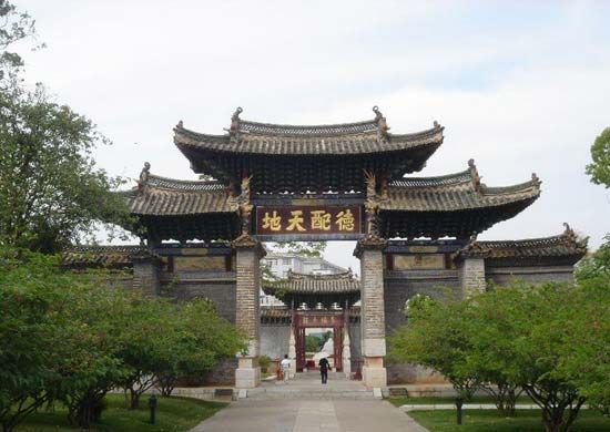 位于建水城文廟北街的建水文廟,建于元泰安二年。其規(guī)模僅次于山東曲阜文廟。占地114畝。總體布局采用中軸對(duì)稱宮殿式,仿曲阜孔廟的建筑風(fēng)格建造。主要建筑有相對(duì)稱的一正殿二廡二堂二閣三祠八坊。保存完好,規(guī)模宏大,雄偉壯觀,莊嚴(yán)肅穆。文廟正殿“先師廟”,殿前懸掛“先師廟”三個(gè)鎏金大字,筆力遒勁雄渾。正殿由二十八根大石柱支撐,柱高五米多,用整塊青石鑿磨而成,每根石柱重約萬斤。其中撐持在左右屋檐的兩根“石龍抱柱”,精工雕鏤成龍騰祥云狀。大殿二十二扇木屏門上,鏤刻出近百飛禽走獸,工藝精巧,栩栩如生,為屏門珍品。殿壁的石碑上,有“扁鵲圖”、“圍獵圖”、“歌舞圖”、“雜技圖”等等。殿前有高大的銅香爐一座,爐上鑄有無數(shù)條大小游龍,騰云飛躍。庭中古柏后有一對(duì)石象,背上馱著五尺高的青銅花瓶。文廟共有六進(jìn)院宅,縱深六百二十五米。進(jìn)入高達(dá)九米的“太和元?dú)?rdquo;坊,有一潭碧波,是占地四十多畝的“泮池”。橢圓形的池中有一半島,島上有“思樂亭”倒映湖中,過去曾是建水十景之一的“學(xué)海文瀾”。向前,到“洙泗淵源”坊,墻邊有明清時(shí)代的雕刻二十余塊,是研究滇南史的寶貴資料。文廟西有參天古木,仔細(xì)辨認(rèn),是兩株樹共生,一株是柏樹,一株是榕樹,榕樹主干緊緊纏抱柏樹,竟連理同根、合而為一了。相傳此樹為元代種植。