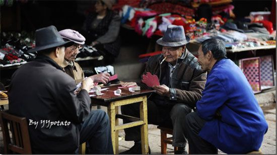 街道兩旁都是小百貨,主要的商品就是各種形狀和不同功用的鹽品,再有就是臘肉、火腿、干豆豉和本地的雀嘴茶。小朋友在地上拍紙游戲,小時候也玩過,因而倍感親切。