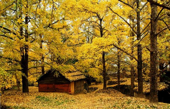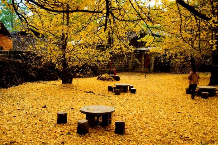 每年10月下旬—12月中旬,是銀杏村賞秋色的最佳季節(jié)。因獨特的地理氣候原因,銀杏村的“花期”較長,每到深秋,房前屋后,小路上、石墻上、瓦房上、水溝中、菜地里……黃葉紛飛,一地金黃。游人身臨其境,仿若走進金色的童話世界