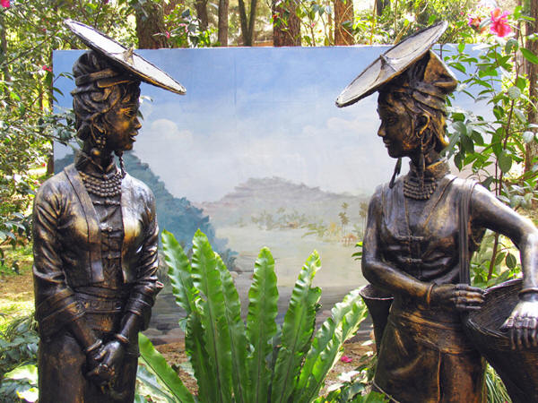 云南十八怪之四、斗笠反著戴:滇中元江、新 平一帶的花腰傣姑娘,黑色鑲花邊衣裙,脖頸胸襟銀飾,頭戴帽沿上翻的白色斗笠,婀娜多姿。