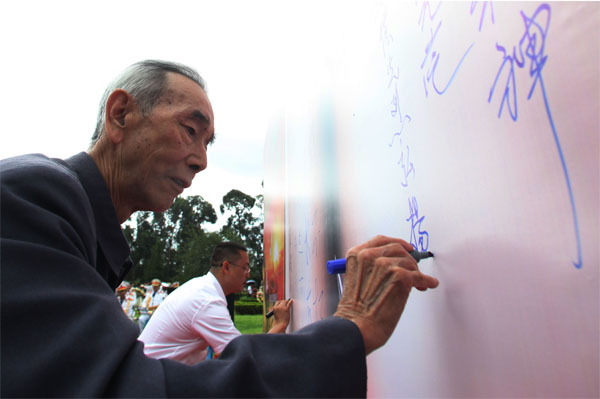 金寶山特別邀請春城晚報(bào)副總編輯、我省著名詩人嘉費(fèi)擔(dān)任《英雄墻上的紅色人生》編委會(huì)主任。在書籍啟動(dòng)儀式上發(fā)表了熱情洋溢的講話,他說:“今天,來到金寶山軍魂園參加《英雄墻上的紅色人生》書籍啟動(dòng)儀式,我倍感榮幸?吹浇饘毶杰娀陥@這樣一個(gè)龐大的精神寶庫,能夠近距離感受到革命先輩留下來的紅色文化,似乎歷史就歷歷在目;再者,看到了來參加活動(dòng)的革命老前輩,他們風(fēng)采仍舊、身體健朗,向人們講述著那個(gè)激情燃燒的紅色歲月,這種感動(dòng)就在眼前,也深植于我們的心間。我們要穿過歷史,回到那個(gè)戰(zhàn)火硝煙的年代,解讀英雄們那些偉岸的背影,參與到每一個(gè)人、每一件事的歷史回眸,為每一個(gè)革命先輩的紅色人生寫下光彩的一筆,在書寫中傾注著我們的崇敬,并圓滿地完成《英雄墻上的紅色人生》這本書籍的編輯工作。”關(guān)于此書的意義,費(fèi)嘉表示,書籍的意義就意味著永恒,通過文字的傳承,那些歷史的記憶是經(jīng)久不衰的。我們把這種值得珍藏和傳承的回憶寫進(jìn)書里,讓書籍成為傳遞英雄紅色文化的載體,為時(shí)代留下英雄的足跡和人生解讀,這無疑是一件十分有意義的事情,而且也是精神文明建設(shè)的組成部分。之后,他在背景墻上留下了“英雄不朽、偉業(yè)長存。”的感言。