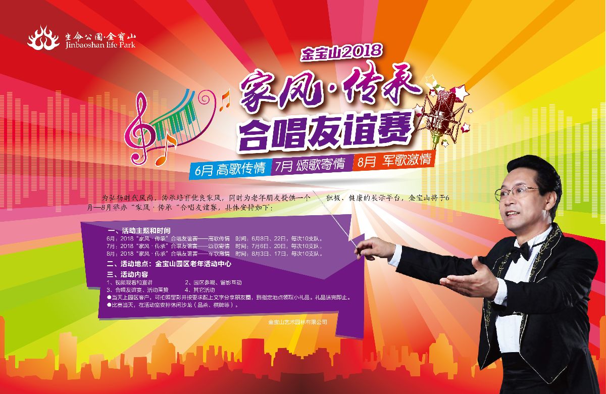 為弘揚(yáng)時(shí)代風(fēng)尚,傳承培育優(yōu)良家風(fēng),同時(shí)為老年朋友提供一個(gè)積極、健康的展示平臺(tái),金寶山將于6月—8月舉辦“家風(fēng)•傳承“合唱友誼賽。6月活動(dòng)已在夏日濃情中展開,在此,我們也歡迎廣大老年朋友一起加入我們的行列,一起感受生命的動(dòng)聽旋律,一起分享熱情不變的快樂!一起共享因快樂而帶給我們的健康!