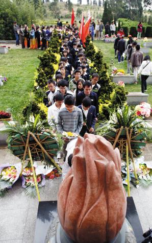 給軍魂園火炬送上鮮花 記者龍宇丹/攝 當(dāng)同學(xué)們把一朵朵寄托追思的白菊花、黃菊花在先輩們的墓前獻(xiàn)上時(shí),他們的表情莊嚴(yán)而凝重,這一刻這群年輕人的心里充滿了對(duì)先輩的敬重和對(duì)生命的思考。