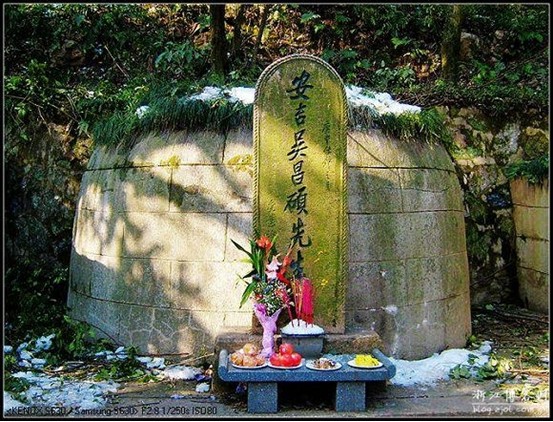 民國(guó)16年十一月(1927年11月6日),吳昌碩突患中風(fēng),十一月初六(1927年11月29日)病逝滬寓,享年84。先生生平酷愛(ài)梅花,常到超山探梅。1927年病故上海,遵其遺愿身后埋骨超山香雪塢,1932年移柩安葬超山大明堂西側(cè)。墓東立有章炳麟篆額、馮君木撰文、于右任書(shū)丹的吳昌碩先生墓表,墓左側(cè)為建于1986年的吳昌碩先生紀(jì)念館,墓門(mén)石柱上刻有沈淇泉(衛(wèi))所撰聯(lián)語(yǔ):"其人為金石家,沉酣到三代鼎彝,兩京碑碣。此地傍玉潛故宅,環(huán)抱有幾重山色,十里梅花。吳昌碩墓1966年被破壞,1980年重建。墓朝東北向,高2米,直徑3米,墓碑由諸樂(lè)三題“安吉吳昌碩先生墓”。大明堂浮香閣藏有陳三立撰文、朱孝藏書(shū)丹、鄭孝胥書(shū)蓋的《安吉吳先生墓志銘》。1989年為浙江省重點(diǎn)保護(hù)文物。