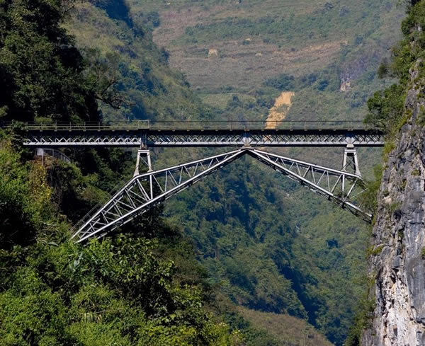 五家寨人字橋是一座大型單軌鋼架鐵路橋,位于屏邊苗族自治縣北灣壙鄉(xiāng)度箐站與倮姑站之間,因形似“人”字而得名。當(dāng)年滇越鐵路到四岔河的兩面陡壁之間,當(dāng)打穿了兩邊懸崖上的隧道時,兩洞口相距僅60多米,可離谷底高達(dá)100多米,按當(dāng)時的技術(shù)建造這樣高的橋墩幾乎是不可能的,各種施工方案一再失敗。后來由承建商——法國巴底紐勒公司董事工程師鮑爾·波。≒aul Bodin)設(shè)計出用人字形鋼梁做橋梁支撐的解決方案。該橋橫跨于兩山懸崖峭壁間,長71.7米,寬4.2米,跨度67.15米,重179.5噸,距谷底102米。工程于1907年3月10日動工,1908年12月6日竣工,歷時21個月。